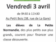 Vendredi 3 avril 2026 de 9h30 à 11h30, à la salle du Petit Bois (38, rue de la Gare) Les élèves de la Petite...
